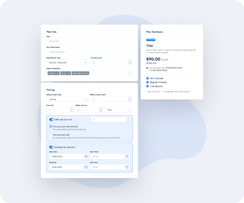 Choose sitewide or category-based access, define titles and descriptions, select specific categories, and configure pricing details like billing intervals, cycle limits, sale pricing, and scheduling. Preview all changes in real time to ensure the plan fits your learning platform perfectly.