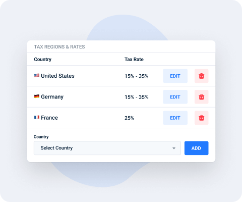 Add a new country in just a few steps. Select the country from the Taxes tab, enter its tax rate as a percentage, and save, making tax management simple and efficient.