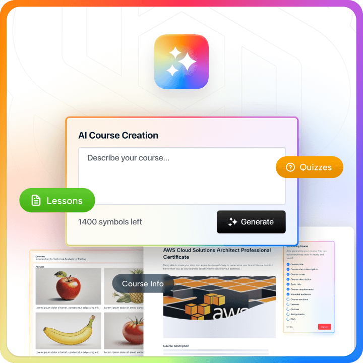 Create courses automatically with intelligent tools developed for educators. Enrich your content, save hours of planning and get a professional result instantly. With AI Lab all you need for generating courses is a single description.