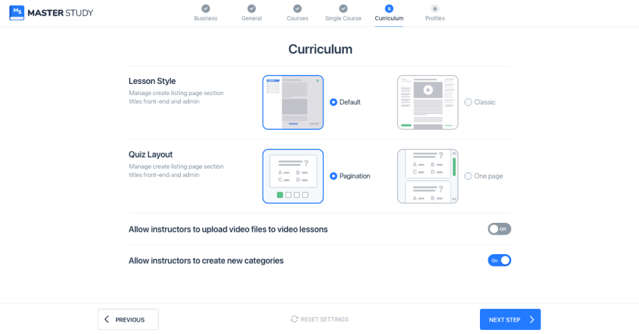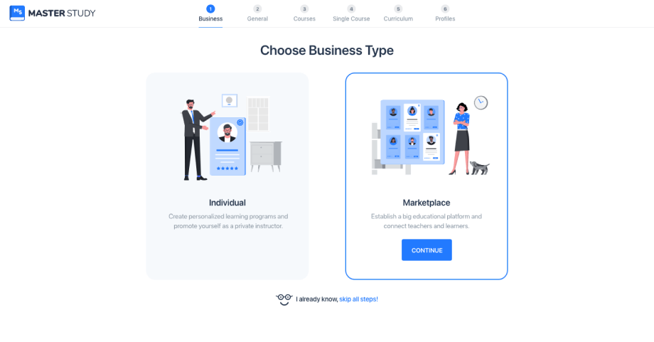 We have built it so that it can be used by individual Elearning companies and instructors, as well as a Udemy-style marketplaces. You choose this at the very first step of our wizard when you activate the MasterStudy LMS plugin.