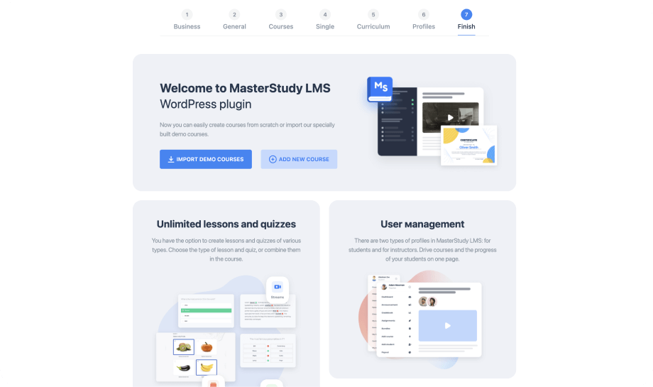 On the final screen, you’re invited to import demo content or add a new course.