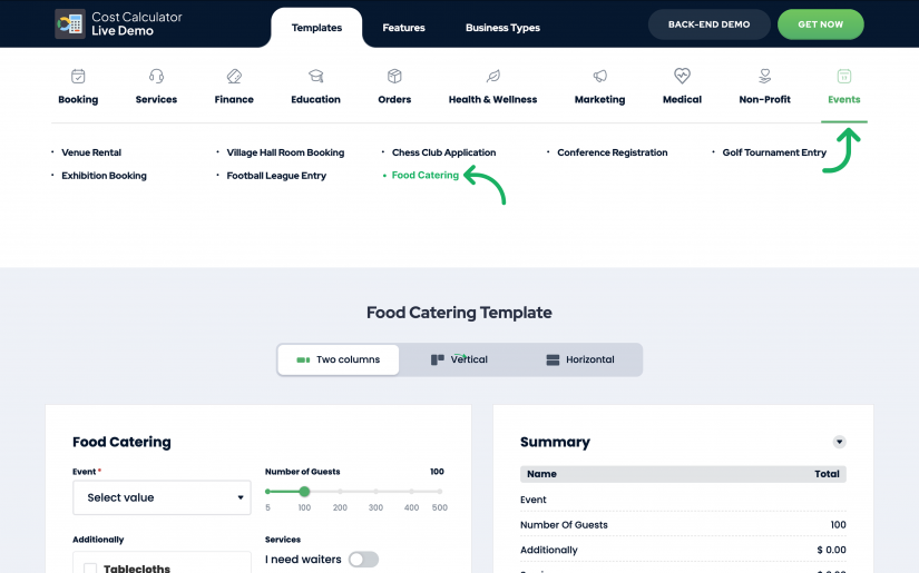 An online pricing calculator can completely transform the way visitors interact with your catering website. Rather than forcing potential clients to scroll through long menus or download static PDFs, a calculator guides users step-by-step through the event planning process, making the experience interactive, intuitive, and satisfying. For example, Cost Calculator by StylemixThemes has three modes for its users, which makes its navigation fast and easy.
