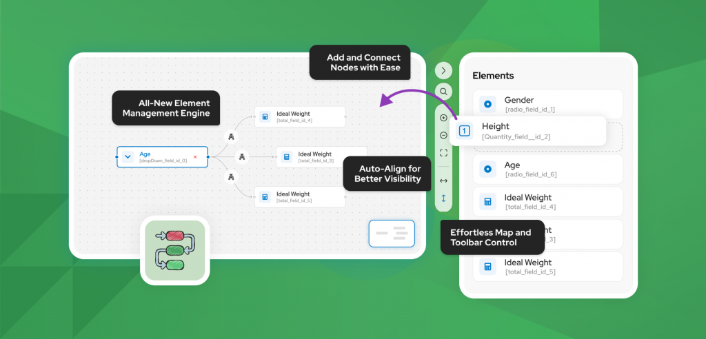 Lines going everywhere? One click and they auto-align into a clean flow. Too many fields on one canvas? Move groups into their own workspaces. Conditions scale with your calculator now, not against it.