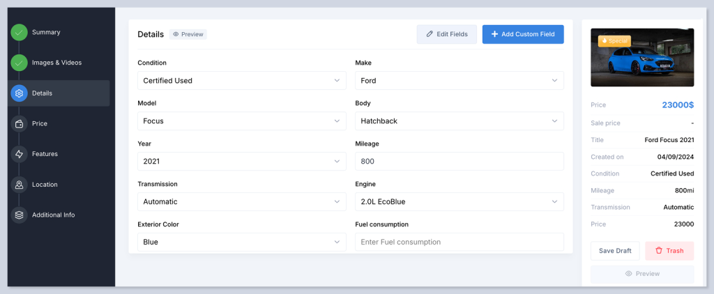 - Unlimited Custom Fields. Add vehicle details like engine specs, interior features, and warranty info.