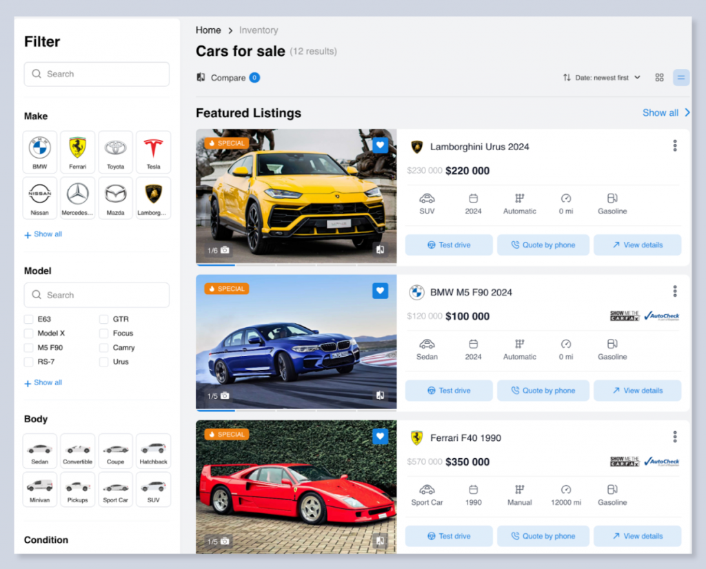 - Saved Searches. Let users save their favorite filters (like “SUV under $20k”) and get notified when new matches show up. A simple way to keep them coming back.